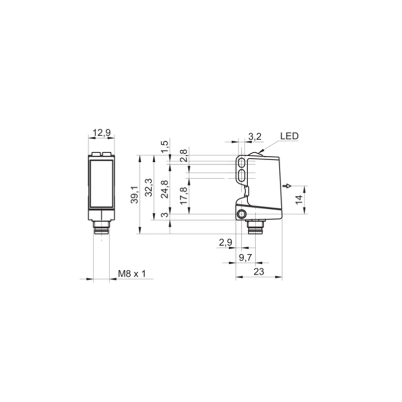 Capteur photoélectrique; Format: Parallélépipédique; Principe du capteur: Barrière simple; Principe de détection: Emetteur; Distance de commutation: 10m (max.: 15 m); Réglage: -; Source d'émission: LED, Lumière rouge; Sortie de commutation: -; Mode de commutation: -; Interface de communication: -; Raccordement: Connecteur mâle M8, 4 pôles; Tension d'alimentation: 10-30Vdc; Dimensions (L x H x P): 12,9 x 32,3 x 23 mm; Matériau du boîtier: Plastique (ASA, PmmA); Indice de protection: IP67; Température de fonctionnement: -25 ... +60 °C; Série: O300