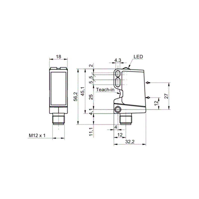 Capteur photoélectrique; Format: Parallélépipédique; Principe du capteur: Détecteur à réflexion directe; Principe de détection: Élimination d'arrière-plan; Distance de commutation: (60 ... 550 mm) (max. 30 ... 600 mm); Réglage: qTeach et Teach externe; Source d'émission: LED, Lumière infrarouge; Sortie de commutation: Push-pull; Mode de commutation: Commutation claire/sombre; Interface de communication: -; Raccordement: Connecteur mâle M12, 4 pôles; Tension d'alimentation: 10-30Vdc; Dimensions (L x H x P): 18 x 45 x 32 mm; Materiau du boîtier: Plastique (ASA, PmmA); Indice de protection: IP67; Température de fonctionnement: -25 ... +60 °C; Série: O500