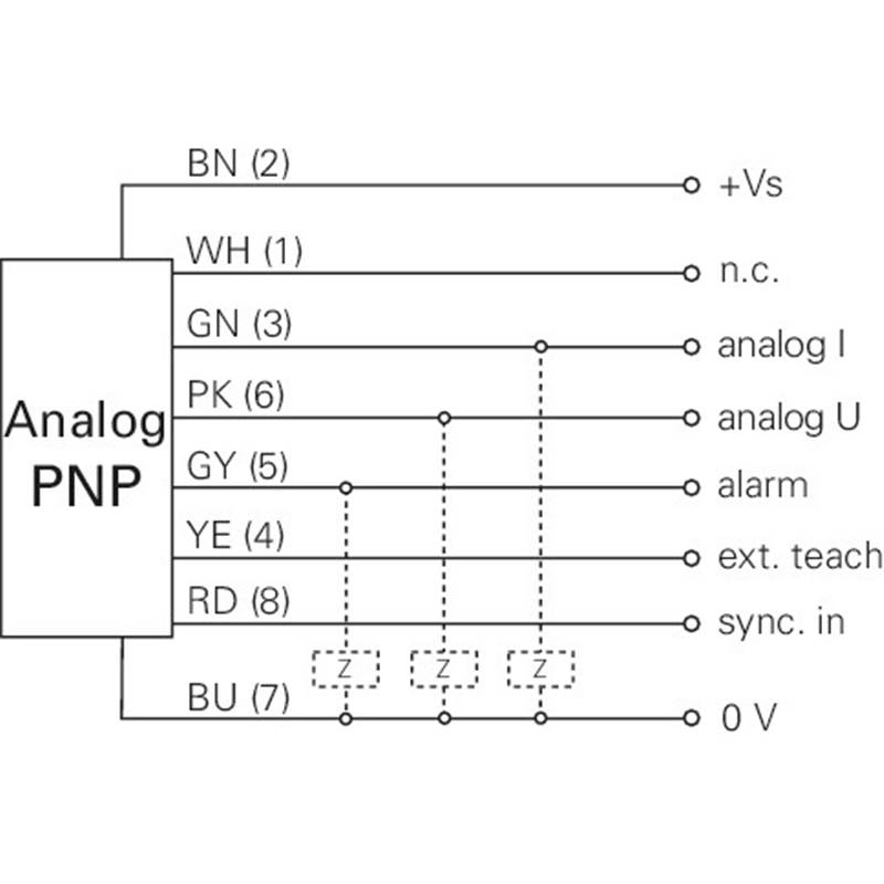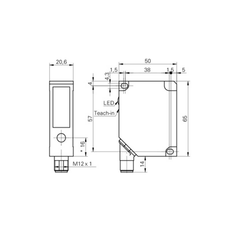 Capteur laser de mesure de distance; Format: Parallélépipédique; Principe du capteur: Détecteur à réflexion directe; Distance de mesure Sd: de 50 ... 300 mm; Résolution: 0,01 ... 0,33 mm; Réglage: Teach-in (Touche / ext.); Source d'émission: Laser, Lumière rouge, Classe 2; Forme du faisceau: Point; Sortie analogique: 4-20mA / 0-10V; Sortie alarme: PNP; Raccordement: Connecteur mâle M12, 8 pôles, orientable; Tension d'alimention: 12-28Vdc; Dimensions: 65 x 50 x 20,6 mm; Matériau du boîtier: Zinc moulé sous pression; Indice de protection: IP67; Température de fonctionnement: 0 ... +50 °C