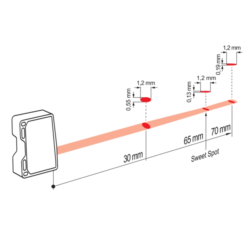 Détecteur de mesure de distance; Version: OM70 laser line basic; Distance de mesure Sd: 30 … 70 mm; Réglage: Webserver, Ethernet TCP/IP; Résolution: 0,7 … 1 µm; Reproductibilité: 0,1 … 0,3 µm; Source d'émission: Laser, Lumière rouge, Classe 1; Forme du faisceau: Ligne; Circuit de sortie: Analogique et digital; Signal de sortie: 4-20 mA / 2-10 mA / 0-10 VDC / 0-5 VDC; Sortie commutation: Push-pull; Fréquence de mesure: 2000 Hz; Interface de communication: Ethernet TCP/IP; Protocole: Profinet (Class B), Modbus TCP, OPC UA, UDP streaming, EtherNet/IP; Webserver: Oui; Raccordement: Connecteur M12 8-pôles & M12 4-pôles; Tension d'alimentation: 15-28Vdc; Dimensions (L x H x P): 26 x 74 x 55 mm; Matériau du boîtier: Aluminium; Face avant (optique): Verre; Indice de protection: IP67; Température de fonctionnement: -10 ... +50 °C; Série: OM70