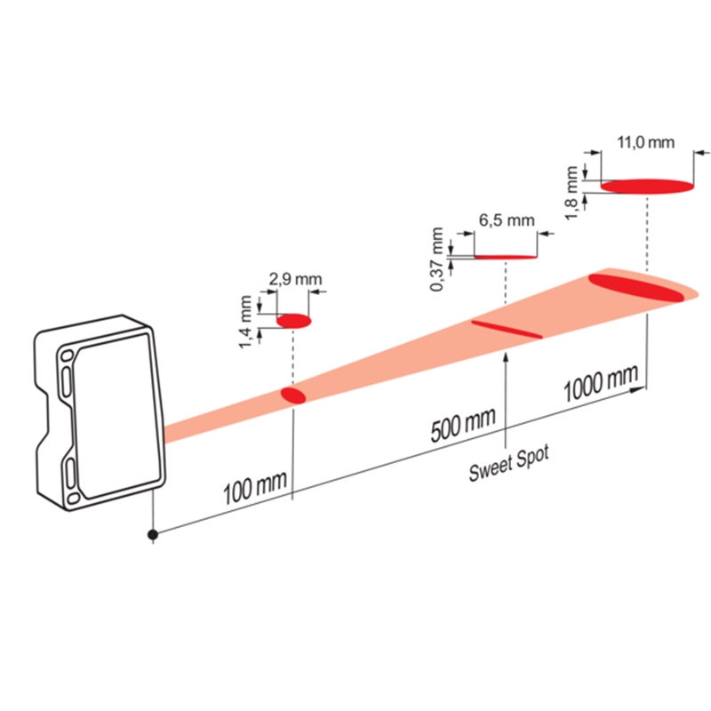 Détecteur de mesure de distance; Version: OM70 laser ligne; Distance de mesure Sd: 100 ... 1000 mm; Plage de mesure Mr: 900 mm; Réglage: Touch Display, RS485; Résolution: 3 ... 63 µm; Reproductibilité: 1 … 32 µm; Source d'émission: Laser, Lumière rouge, Classe 2; Forme du faisceau: Ligne; Circuit de sortie: Analogique et RS 485; Signal de sortie: 4-20mA / 0-10V; Sortie commutation: Push-pull; Fréquence de mesure: 2500 Hz; Interface de communication: RS485; Raccordement: Connecteur M12 8-pôles; Tension d'alimentation: 15-28Vdc; Dimensions: 26 x 74 x 55 mm; Matériau du boîtier: Aluminium; Indice de protection: IP67; Température de fonctionnement: -10 ... +50 °C; Série: OM70