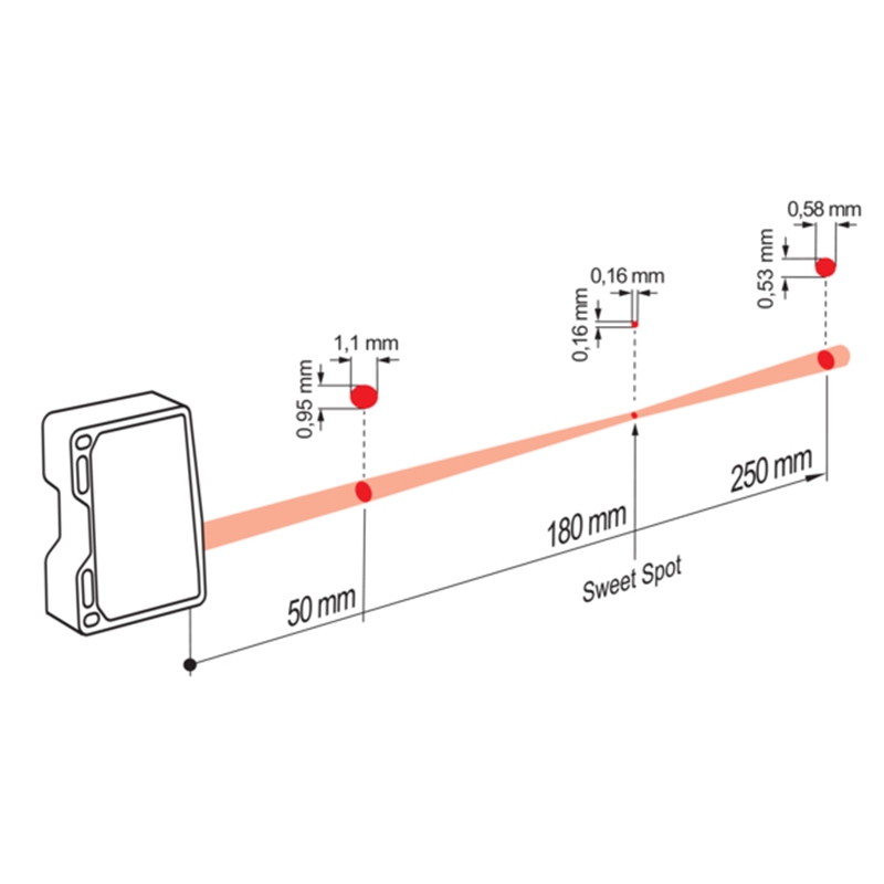 Détecteur de mesure de distance; Version: OM70 laser point; Distance de mesure Sd: 50 ... 250 mm; Réglage: Webserver, Ethernet TCP/IP; Résolution: 1,4 ... 6,3 µm; Reproductibilité: 0,3 … 2 µm; Source d'émission: Laser, Lumière rouge, Classe 1; Forme du faisceau: Point; Circuit de sortie: Analogique et digital; Signal de sortie: 4-20mA / 2-10mA / 0-10Vdc / 0-5Vdc; Sortie commutation: Push-pull; Fréquence de mesure: 2000 Hz; Interface de communication: Ethernet TCP/IP; Protocole: Profinet (Class B), Modbus TCP, OPC UA, UDP streaming, EtherNet/IP; Webserver: Oui; Raccordement: Connecteur M12 8-pôles & M12 4-pôles; Tension d'alimentation: 15-28Vdc; Dimensions (L x H x P): 26 x 74 x 55 mm; Matériau du boîtier: Aluminium; Face avant (optique): Verre; Indice de protection: IP67; Température de fonctionnement: -10 ... +50 °C; Série: OM70