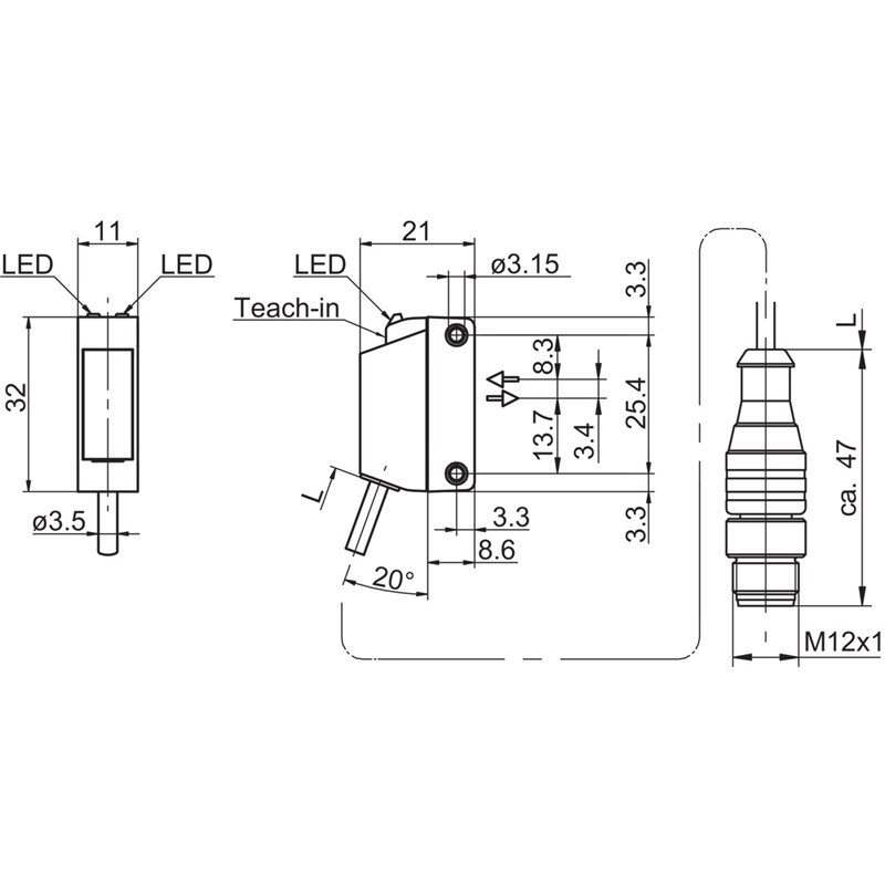 Détecteur de distance; Format: Parallélépipédique; Principe du capteur: Détecteur à réflexion directe; Principe de détection: Time of Flight (Temps de vol); Distance de mesure Sd: 0 … 2500 mm; Reproductibilité: max. 2 … 1,5; Dérive de linéarité: ± 10 mm; Source lumineuse: Laser infrarouge, Classe 1; Forme du faisceau: Point; Réglage: Teach-in local et IO-Link; Sortie de commutation: Push-Pull; Mode de commutation 1: Commutation claire réglable; Sortie analogique: Tension, 0 ... 10 Vdc; Interface de communication: IO-Link V1.1.4, 230,4 kBaud (COM 3); Raccordement: Câble avec connecteur M12, pôles, 300 mm, PVC; Tension d'alimentation+Vs: 12-30Vdc; Dimensions (l x L x P): 11 mm 32 mm x 21 mm; Matériau du boîtier: Plastique (ABS, ASA, PMMA); Face avant (optique): PMMA; Classe de protection: IP67; Température de fonctionnement: -25 … +55 °C; Série: OT300