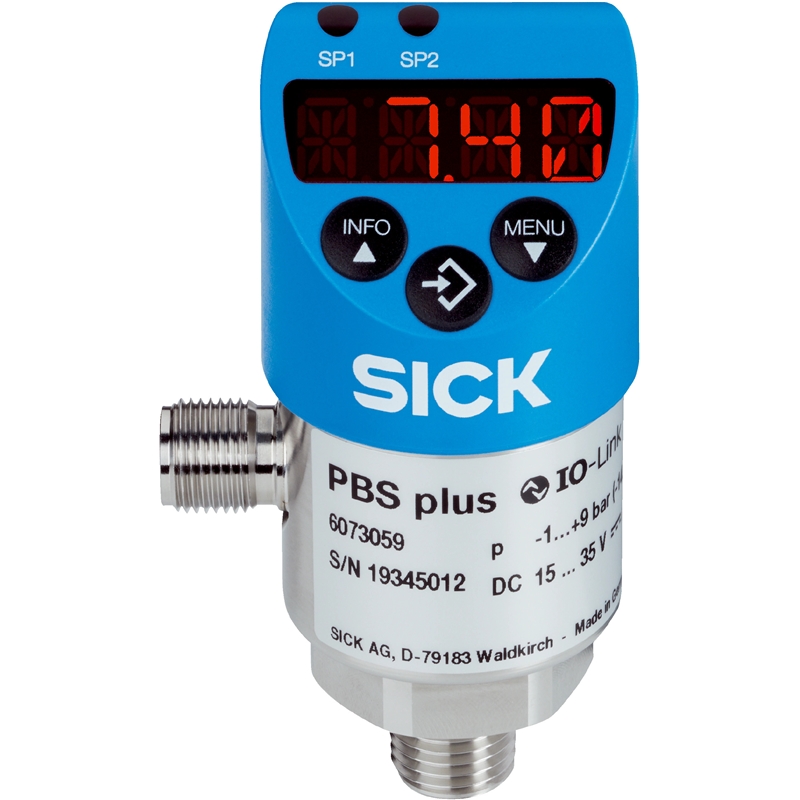 Le PBS plus réunit un capteur de pression électronique, un transmetteur de pression et un afficheur dans un seul et même appareil et est disponible avec jusqu’à deux sorties de commutation, une sortie analogique et IO-Link. Il est réglé à l’aide de trois grandes touches et de l’afficheur ou par IO-Link. Le boîtier est à orientation double. Il est ainsi possible d’aligner parfaitement l’afficheur et le raccordement électrique quelle que soit la position de montage. Le PBS plus sert à de multiples applications grâce à ses plages de mesure allant de 0,4 bar à 1.000 bars (pression relative). Il offre également des plages de mesure du vide et de la pression absolue. La membrane en acier inoxydable entièrement soudée rend le PBS plus très résistant à la corrosion. Les données de processus sont transmises à une commande par IO-Link comme mesures en bars. Les possibilités de diagnostic permettent de lire les valeurs de température en °C et de surveiller les valeurs minimales et maximales de température et de pression.