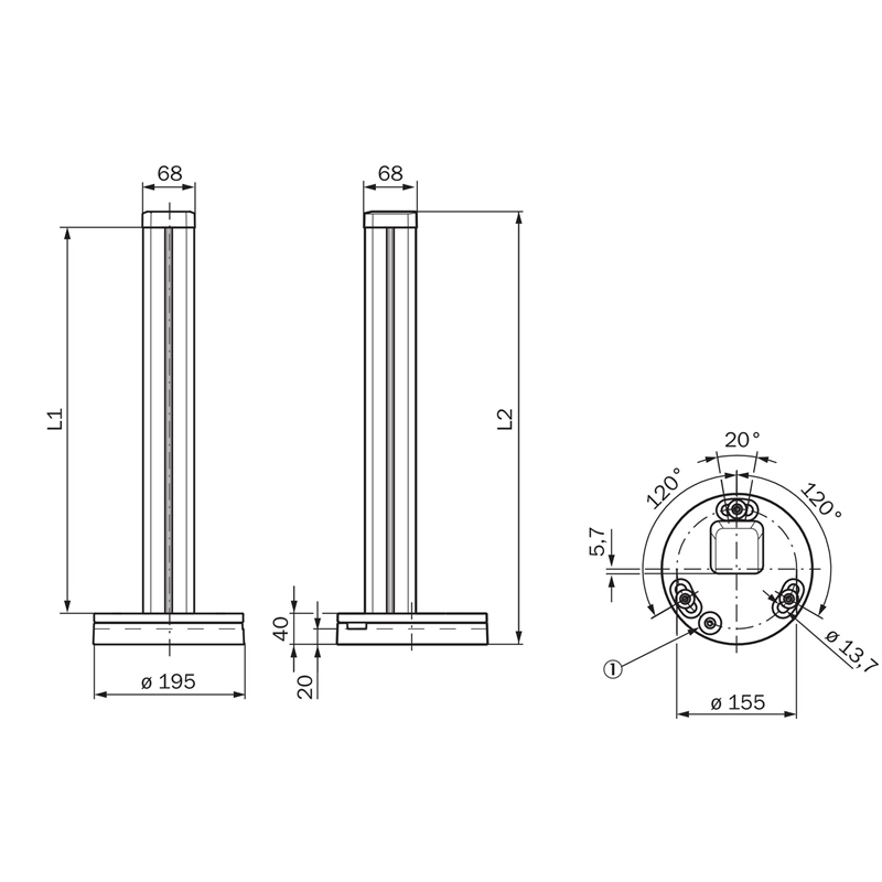 Colonne compacte PC4 pour le montage de variantes adaptées des gammes de produits deTec et deTem.; Hauteur de colonne: 1.560,5 mm; Section profil de la colonne: 68 mm x 68 mm; Diamètre de plaque de fond: 195 mm; Type de fixation: Ancrage mécanique au sol; Convient à toutes les variantes d’appareils: - Barrage immatériel de sécurité deTec: Hauteur du champ de protection max. 1.350 mm, - Barrière immatérielle de sécurité multifaisceaux deTem: Quelconque; Matériau: Aluminium; Contenu de la livraison: - Colonne de montage PC4 avec plaque d’alignement prémontée et capuchon amovible, - Plaque de fond avec niveau à bulle, molette d’alignement fin et vis sans tête, - Vis M8 et rondelles pour fixer la plaque d’alignement sur la plaque de fond, - Notice d’instruction à télécharger