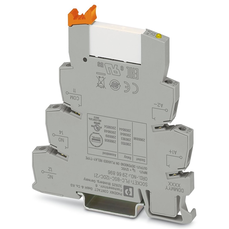 Interface PLC, comprend l'embase PLC-BSC.../21 avec connexion vissée et un relais miniature enfichable à contact de puissance, se monte sur profilé NS 35/7.5, 1 inverseur, tension d'entrée 12 V DC