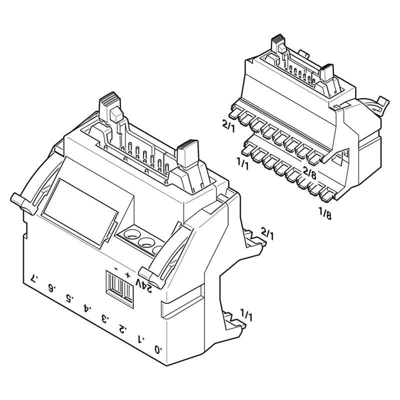 Adaptateur de précâblage PLC-V8, permet l'interfaçage en sortie de 8 relais PLC 6,2 mm (voir guide de choix pour compatibilité). Connecteur pour câble préconfectionné HE10 - 14 pôles, logique de commutation +.
