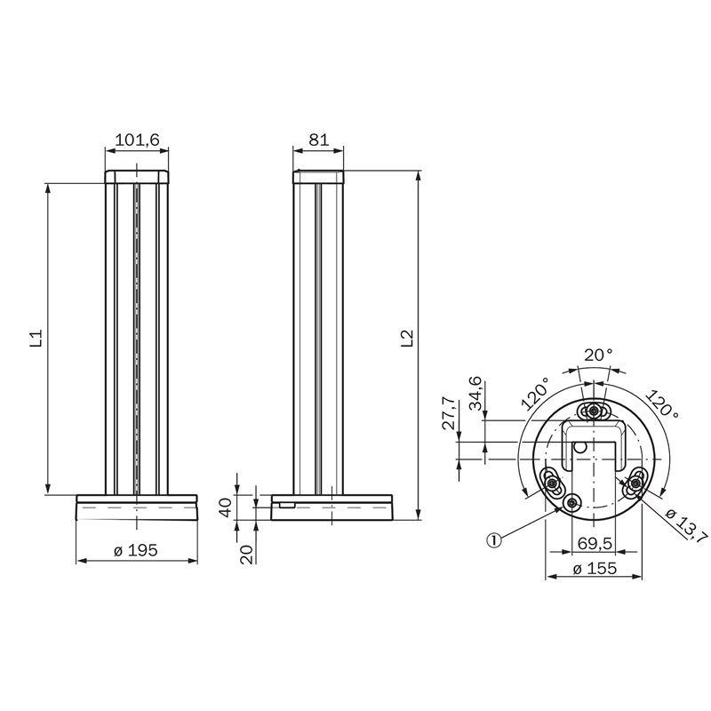 Colonne de montage d'appareil avec rainures externes; Modèle: PP4 Protective Column; Hauteur de colonne: 2.010,5 mm; Type de fixation: Ancrage mécanique au sol; Convient à: - Barrage immatériel de sécurité deTec: Hauteur du champ de protection max. 1.800 mm, - Barrière immatérielle de sécurité multifaisceaux deTem: Quelconque; Hauteur du premier faisceau au-dessus du sol: 200 mm; Contenu de la livraison: - Colonne de montage PP4 avec plaque d’alignement prémontée et capuchon amovible, - Plaque de fond avec niveau à bulle, molette d’alignement fin et vis sans tête, - Vis M8 et rondelles pour fixer la plaque d’alignement sur la plaque de fond, - Pince d’alignement, - Notice d’instruction à télécharger; Série: PP4