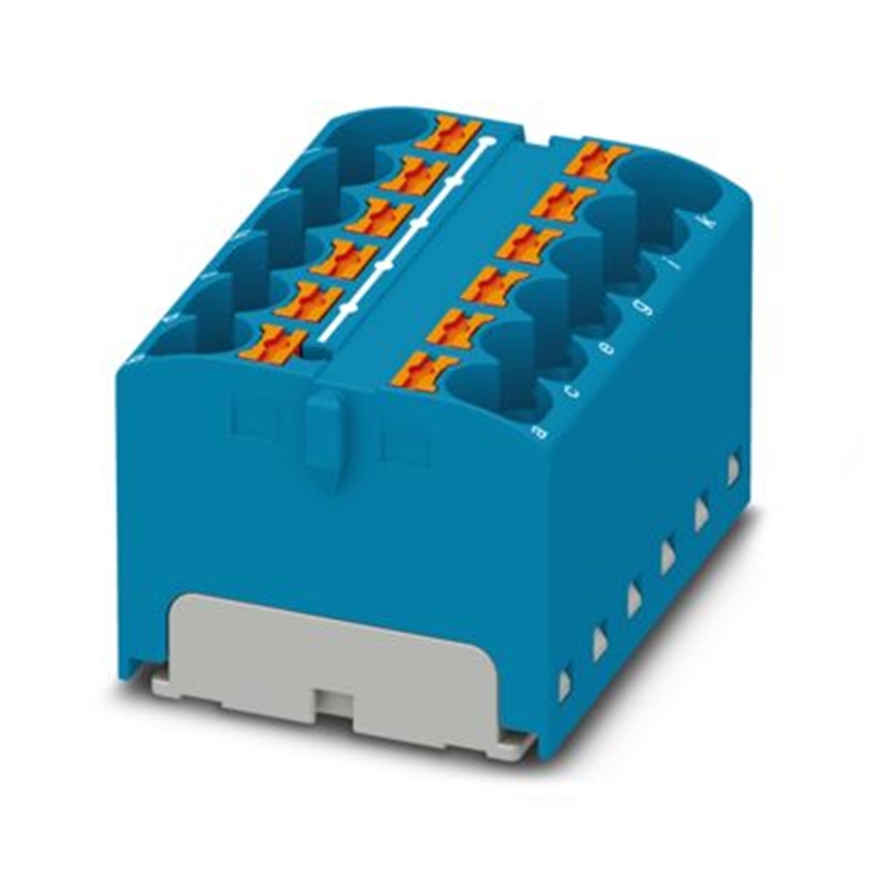 Bloc distributeur, 630 V,32 A, Push-in, nb. de connexions: 12, section :0,2 mm² - 6 mm², AWG: 24 - 10, largeur: 36,9 mm, hauteur: 21,7 mm, couleur: bleu, type de montage: adhésif