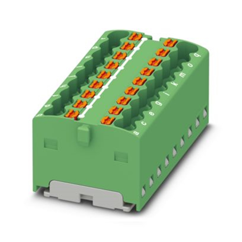Bloc distributeur, Push-in, nombre de connexions : 18, sections : 0,14 mm² - 1,5 mm², largeur : 39,9 mm, hauteur : 17,6 mm, couleur : vert, type de montage : adhésif