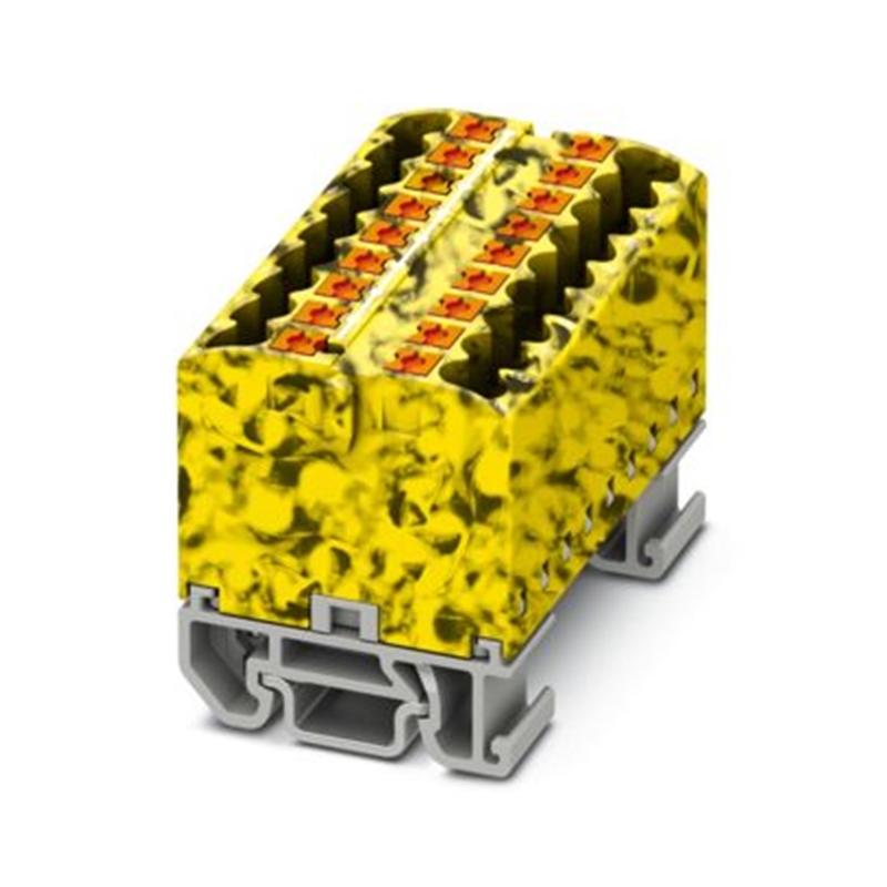 Bloc distributeur, pour montage longitudinal, Push-in, nombre de connexions : 18, sections : 0,14 mm² - 4 mm², largeur : 46,5 mm, hauteur : 30 mm, couleur : noir/jaune, type de montage : NS 15