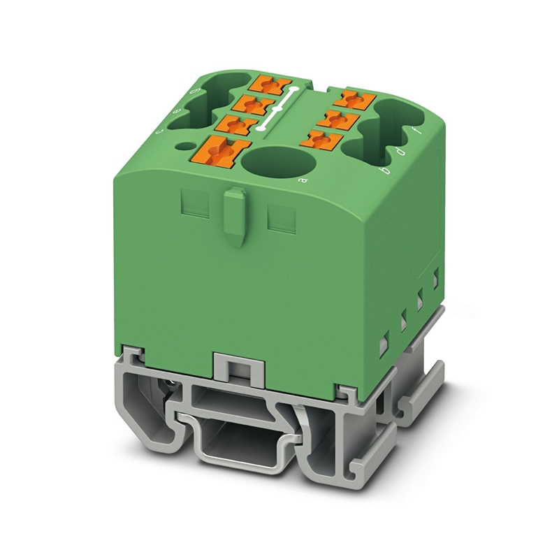 Bloc distributeur, Bloc avec orientation horizontale et alimentation intégrée, tension nominale: 690 V, intensité nominale: 24 A, nombre de connexions: 7, type de raccordement: Raccordement Push-in, Dérivation, section : 0,14 mm² - 4 mm², Raccordement Push-in, Raccordement collectif, Section de référence: 6 mm², section : 0,5 mm² - 10 mm², type de montage: NS 15, coloris: vert