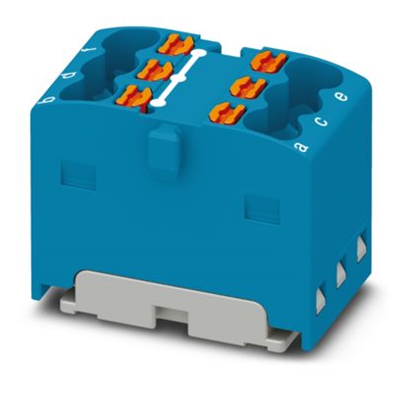 Bloc distributeur, Push-in, nb. de connexions : 6, sections : 0,14 mm² - 1,5 mm², largeur : 14,7 mm, hauteur : 17,6 mm, couleur : bleu, type de montage : adhésif