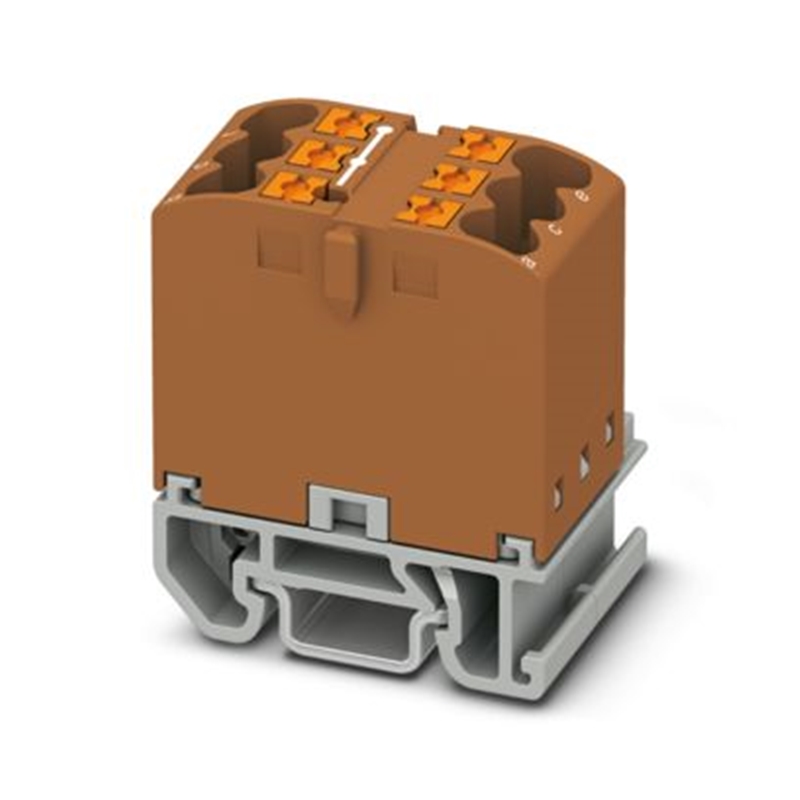 Bloc distributeur, pour montage longitudinal, Push-in, nombre de connexions : 6, sections : 0,14 mm² - 4 mm², largeur : 15,6 mm, hauteur : 30 mm, couleur : marron, type de montage : NS 15