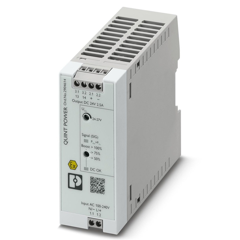 L'alimentation QUINT POWER a été spécialement développée pour l'alimentation électrique des produits de Phoenix Contact compatibles via le connecteur de bus sur rail DIN T-Bus. De plus, un enclenchement direct sur le rail DIN est possible. L'appareil est muni d'un vernis de protection et dispose des homologations CEIEx, ATEX et HazLoc. L'OVP (Over Voltage Protection) <30 V DC protège votre installation contre l'augmentation de la tension. En cas de défaillance, la sortie est coupée pour protéger les récepteurs contre les surtensions. Le circuit de sortie est découplé par un MOSFET.