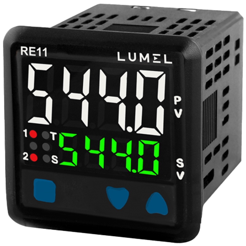 Régulateur de Température LOW COST - RE11; Format: 48x48 mm; 4+4 chiffres, double affichage LED 7 segments à contraste élevé.; Entrée universelle pour capteurs TC/ RTD.; PID, contrôle ON-OFF.; Autoréglage / Autoadaptation.; Deux points de consigne.; °C / °F sélectionnable.; Sortie de contrôle configurable: relais ou SSR.; Sortie auxiliaire : Relais.; Tension d'alimentation: 85 à 270V AC / DC