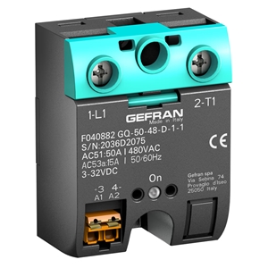 Relais statique; Type : Monophasé; Mode de commutation : Zéro de tension; Courant nominal : 50 Aac; Tension nominale : 48...480 Vca (max range 40...528Vca); Fréquence nominale : 45...65Hz; Tension de commande : 3...32 Vcc; Protection sur la tension : Externe; Raccordement pour signal...