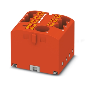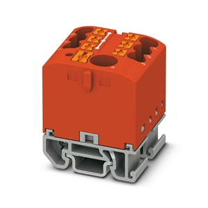 Bloc distributeur, pour montage longitudinal, alimentation intégrée, Push-in, nombre de connexions : 7, sections : 0,14 mm² - 4 mm², largeur : 25,2 mm, hauteur : 30 mm, orange, NS 15