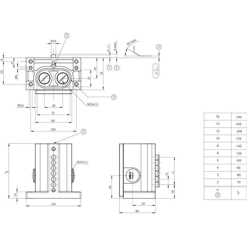 Boîtier multipistes; Modèle: Vertical, selon DIN 43697; Élément d'actionnement: Poussoir en toit; Pas entre les poussoirs: 12 mm; Principe actif: Mécanique; Force d’actionnement: min. 20 N; Nombre d’éléments de commutation: 4; Contact: 1 O + 1 F (ES 514); Principe de commutation: Élément de contact à action brusque; Type de raccordement: 4x M25 x 1,5; Section de raccordement: 0.34 ... 1.5 mm²; Matériau: - Contact: Alliage argent, doré par soufflage- Boîtier: Aluminium moulé sous pression anodisé; Indice de protection: IP67; Température ambiante: -5 ... 80 °C; Série: RGBF