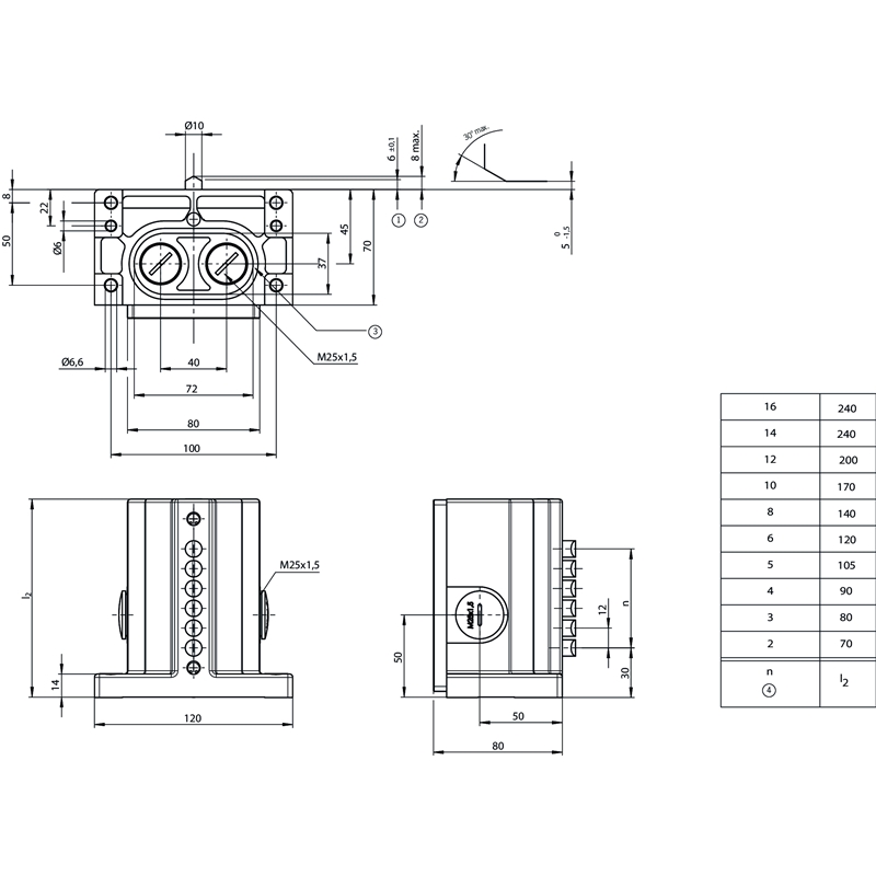 Boîtier multipistes; Modèle: Vertical selon DIN 43697; Élément d'actionnement: Poussoir à galet; Pas entre les poussoirs: 12 mm; Principe actif: Mécanique; Force d’actionnement: min. 20 N; Nombre d’éléments de commutation: 5; Contact: 1 O + 1 F (ES 502 E); Principe de commutation: Élément de contact à action brusque; Type de raccordement: 4x M25 x 1,5; Section de raccordement: 0.34 ... 1.5 mm²; Matériau: - Contact: Alliage argent, doré par soufflage- Boîtier: Aluminium moulé sous pression anodisé; Indice de protection: IP67; Température ambiante: -5 ... 80 °C; Série: RGBF