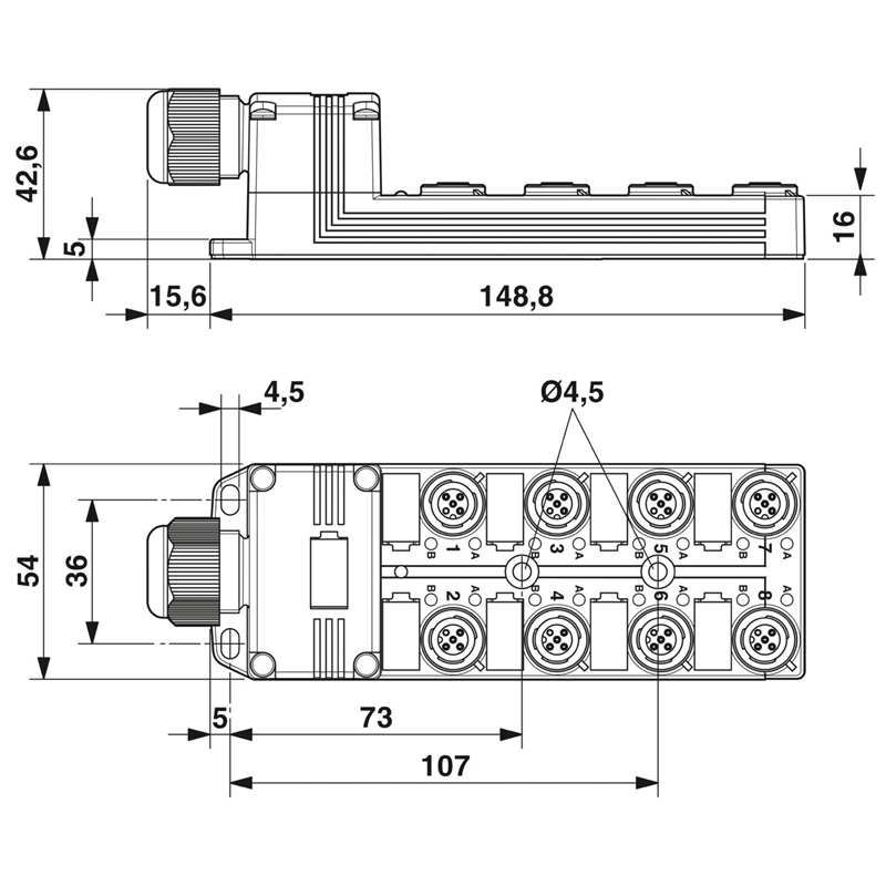 Boîtier répartiteur, application : Standard, type de raccordement: Connecteur femelle M12 Plastique, nombre de prises: 8, nombre de pôles: 5, codage: A, affectation des prises: double, affichage d'état: oui, PNP; racc. câble multicond.: Raccordement vissé enfichable 180°, blindage: non