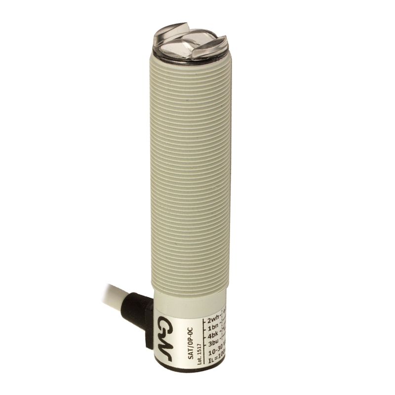 Capteur photoélectrique; Format : Cylindrique fileté, M18 x 1, faisceau axial; Principe du capteur : Détecteur à réflexion directe; Principe de détection : Focale fixe; Portée Sn : 12 mm; Réglage : Potentiomètre; Source d'émission : LED, Lumière rouge; Sortie de commutation : PNP; Type de commutation : Contact (NO/NF); Temps de réponse : 500 µs; Fréquence de commutation : 1 kHz max.; Raccordement : Câble 2 m, PVC, radial; Tension d'alimentation : 10-30 Vdc; Diamètre : Ø 18 mm; Longueur totale du boîtier : 79 mm; Longueur de filetage utile : 58 mm; Matériau boîtier : PBT; Matériau de la tête active : PMMA; Classe de protection : IP67 (EN60529); Température ambiante : -25…70°C; Homologations : CE; Série : SA