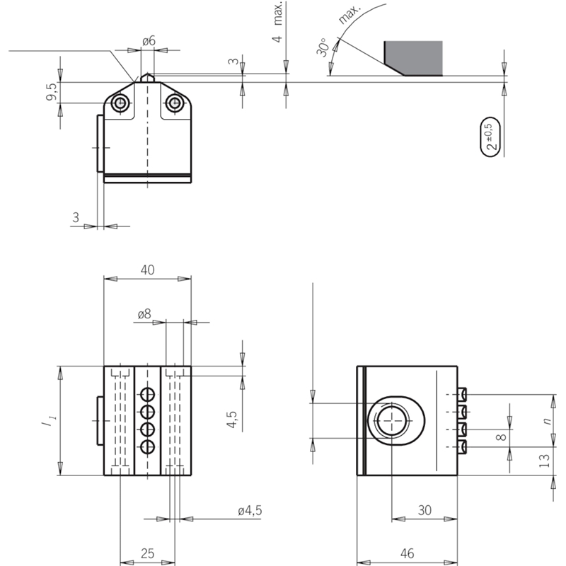Boîtier multipistes; Modèle: Vertical, sans bride; Élément d’actionnement: Poussoir à galet; Pas entre les poussoirs: 8 mm; Principe actif: Mécanique; Force d’actionnement: min. 20 N; Position de montage: Au choix; Nombre d’éléments de commutation: 2; Contact: 1 contact inverseur standard (ES 552); Élément de commutation: Élément de contact à action brusque; Type de connexion: 1 x M16 x 1,5; Section de raccordement: 0.14 ... 1.0 mm²; Matériau:- Contact: Alliage argent, doré par soufflage- Boîtier: Aluminium moulé sous pression anodisé; Indice de protection: IP67; Température ambiante: -5 ... +80 °C; Série: SB