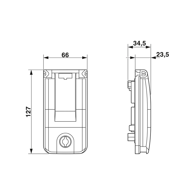 Cadre de montage pour une face avant/prise de courant, cadre en plastique : noir, couvercle en plastique : gris, fermeture avec clé à double panneton de 3 mm et bouton rotatif fourni.