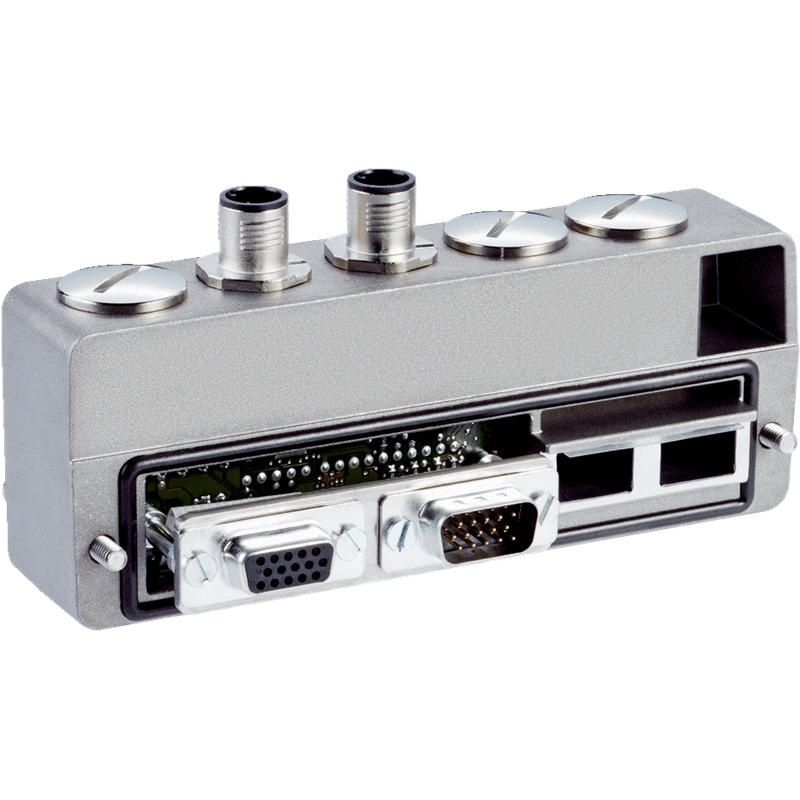Connecteur / Câble de raccordement; Type: Cache de connecteur esclave; Type de signal: CAN, Ethernet, RS-232, FSI; Raccordement A: Connecteur mâle, Connecteur D-Sub-HD, femelle, droit, 15 pôles; Raccordement B: Connecteur M12, mâle, 8 pôles, Connecteur femelle, RJ45, 5 pôles; Câble: 0 m; Blindage: Blindé; Indice de protection: IP65; Description: Pour le mode de raccordement tête B: connecteur femelle M12, 5 pôles; 2 connecteurs femelles RJ-45