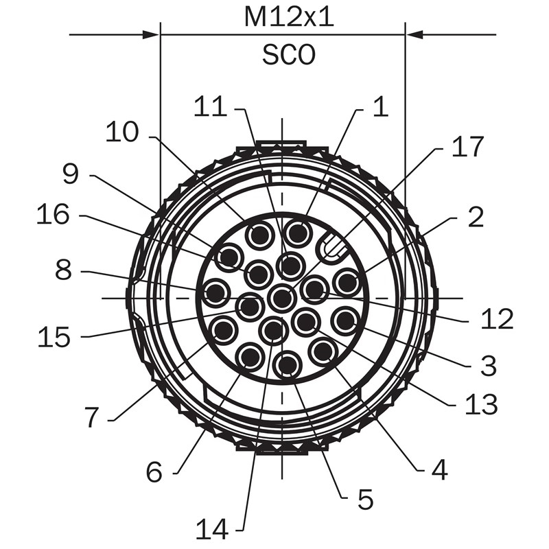 • Raccordement B: Connecteur M12, mâle, droit, 17 pôles, codé A