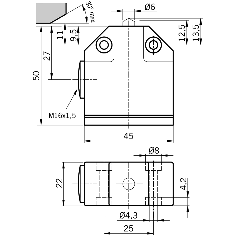 Fin de course monopiste de précision; Actionneur: Poussoir à bille; Force d’actionnement 15 ... 20 N; Position de montage: Au choix; Principe de commutation: 1 Inverseur avec action brusque; Matériau des contacts: Alliage argent, doré par soufflage; Raccordement: 1x M16 x 1,5; Matériau du boîtier: Alliage léger moulé sous pression, anodisé; Indice de protection: IP67; Température ambiante: -5 ... 80 °C; Série: SN01