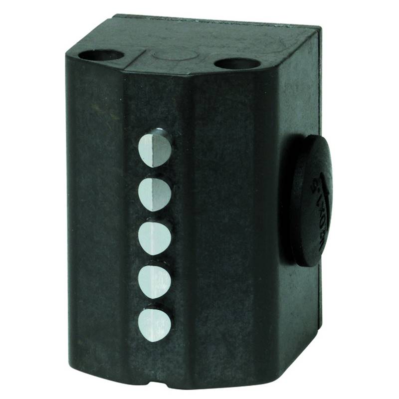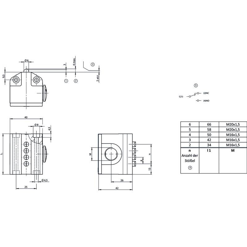 Boîtier multipistes; Modèle: Vertical, sans bride; Élément d’actionnement: Poussoir en toit; Pas entre les poussoirs: 8 mm; Principe actif: Mécanique; Force d’actionnement: min. 15 N; Position de montage: Au choix; Nombre d’éléments de commutation: 2; Contact: 1 contact inverseur adapté aux courants faibles (ES 614); Élément de commutation: Élément de contact à action brusque; Type de connexion: 2 x M16 x 1,5; Section de raccordement: 0.14 ... 1.0 mm²; Matériau: - Contact: Contacts en forme de croix, or- Boîtier: Aluminium moulé sous pression anodisé; Indice de protection: IP67; Température ambiante: -5 ... +80 °C; Série: SN