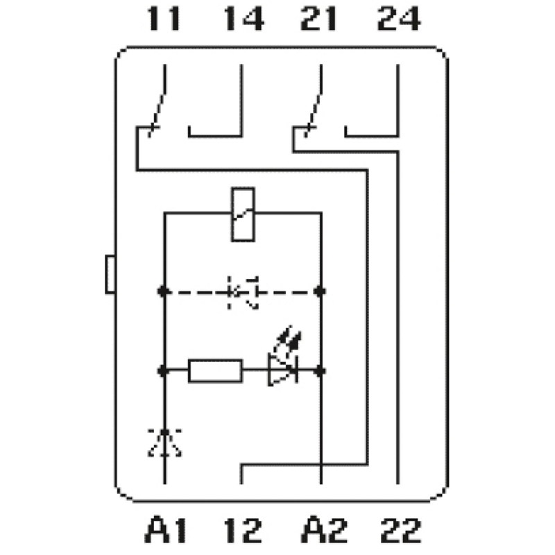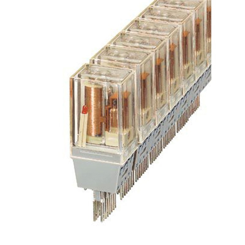 Fiche porte-relais, équipée d'un relais miniature rond Hengstler, contacts (AgCdO+Au) : puissances faibles à fortes, 2 inverseurs, tension d'entrée 24 V DC, avec voyant, s'enfiche sur les bases multipolaires