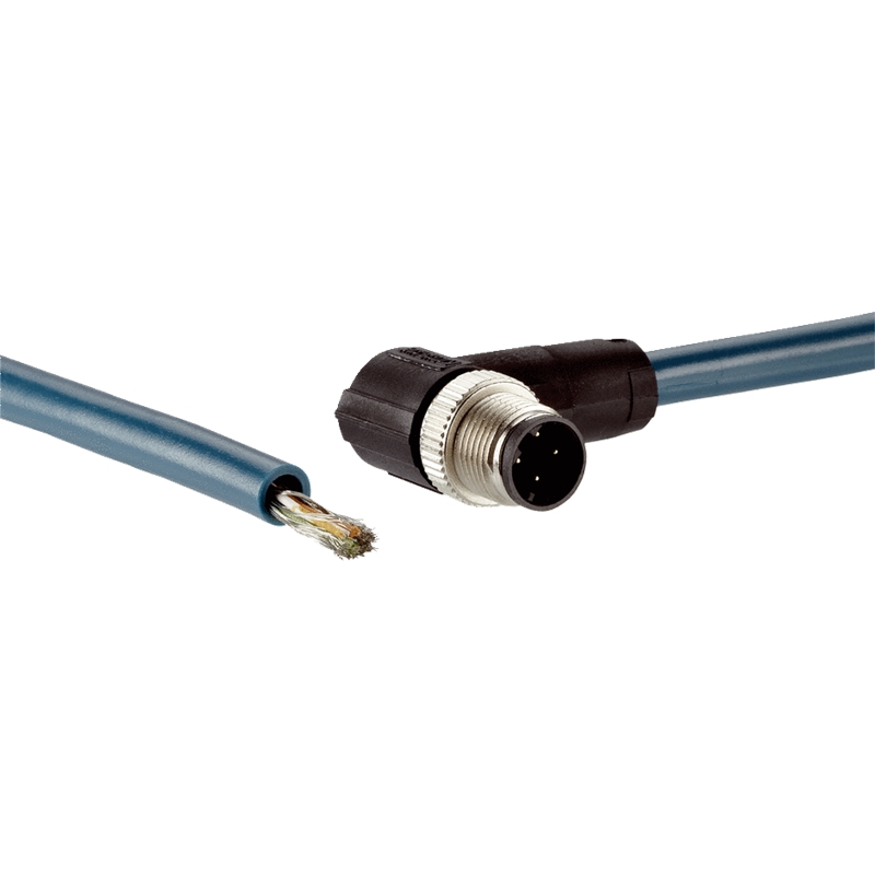 Connecteur / Câble de raccordement; Type: Câble de connexion, M12 x 1; Type de signal: Ethernet; Raccordement A: Connecteur M12, mâle, coudé, 4 pôles, codé D; Raccordement B: Extrémité de câble libre; Câble: 5 m, 4 fils, CAT5, CAT5e, PUR, sans halogène, bleu translucide (RAL 5021); Blindage: Blindé; Degré de protection: IP65, IP67; Température de service: –20 °C ... +80 °C