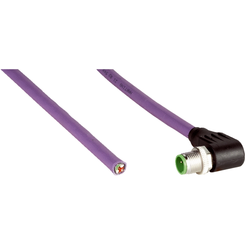 Connecteur et câble; Autre connecteur mâle et câble; Type de signal: PROFIBUS DP; Raccordement A: Connecteur mâle, M12, 5 pôles, coudé, Codage B; Raccordement B: Extrémité de câble ouverte; Câble: 5 m, 2 fils, PUR, sans halogène; Blindage: Blindé; Domaine d'utilisation: Domaine de l’huile/des lubrifiants, Mode chaîne porte-câble