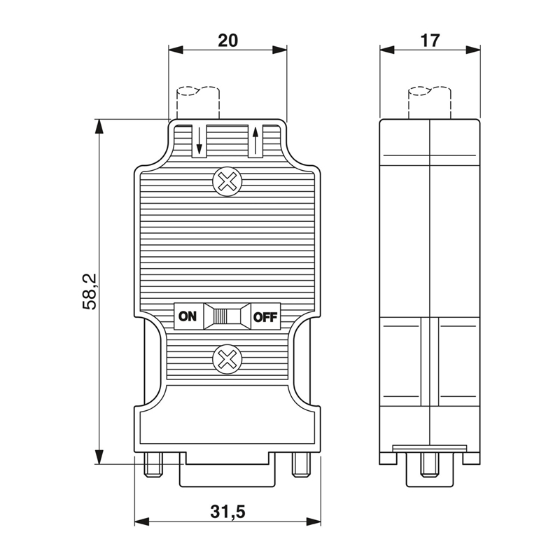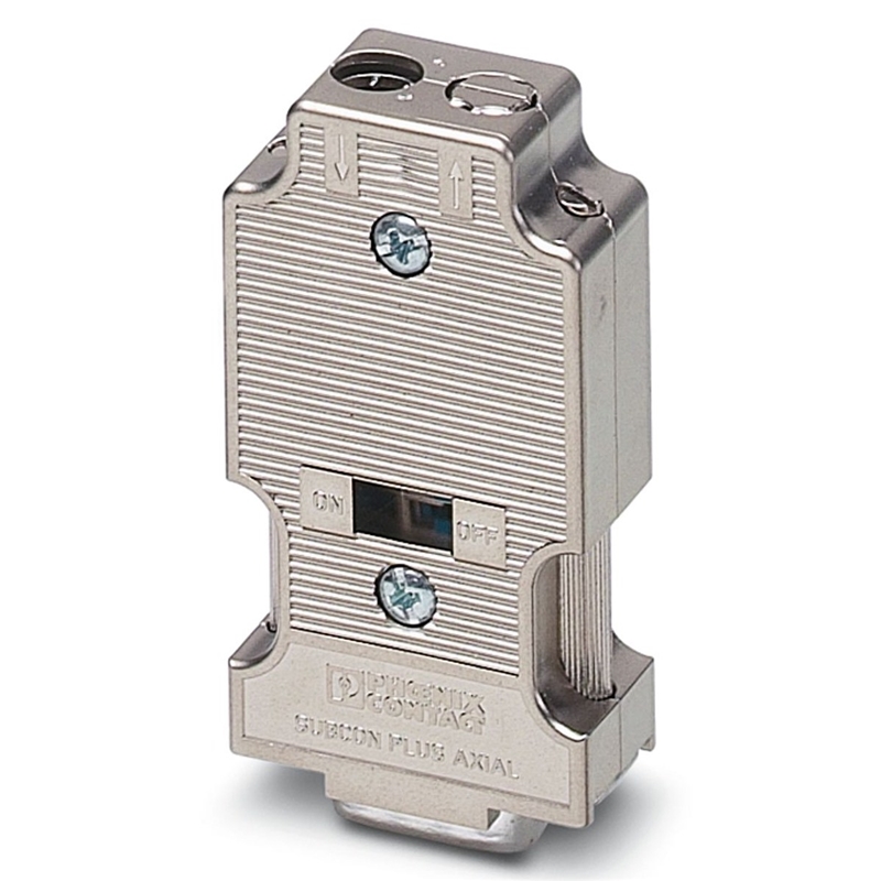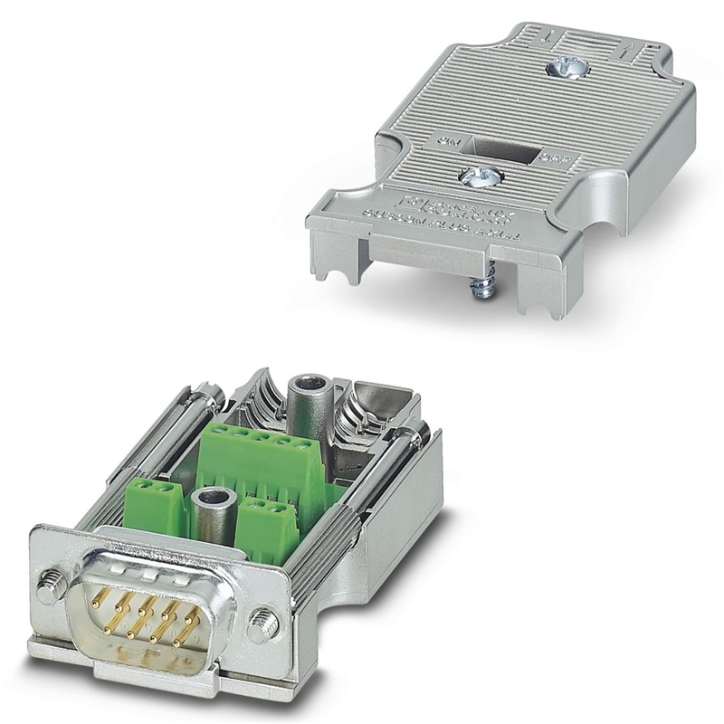 Connecteur D-SUB, 9 pôles, mâle, modèle axial avec deux arrivées de câbles, type universel pour tous systèmes, brochage: 1, 2, 3, 4, 5, 6, 7, 8, 9 sur bloc de jonction à vis