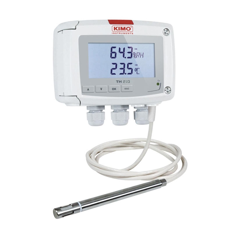 Capteur d'hygrométrie et de température type TH210-HODI150-R-10X. Boîtier ABS V0 IP65, avec afficheur 19 digits 2 lignes rétroéclairable avec indicateur de tendance, sonde déportée en inox avec filtre inox longueur 150 mm et câble longueur 10 m. Gamme 5 à 95 %HR et -40 à 180 °C. 2 sorties analogiques technologie 4 fils 0-5/10 V ou 0/4-20 mA et 2 sorties relais inverseur 3A/230V. Alimentation 115/230 Vac avec isolation galvanique. En option: logiciel de configuration LCC-S.