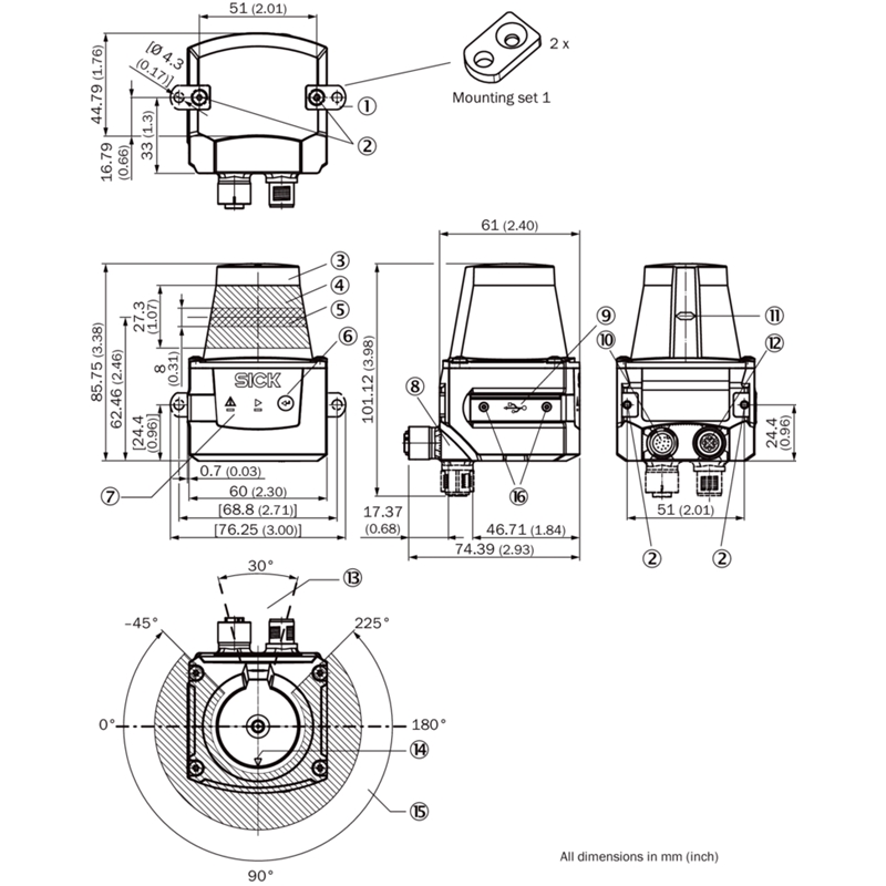 • Raccordement: 1 x raccordement « Ethernet », connecteur femelle M12 4 pôles, 1 x raccordement « alimentation électrique », connecteur mâle M12 12 pôles, 1 x connecteur femelle Micro-USB, type B