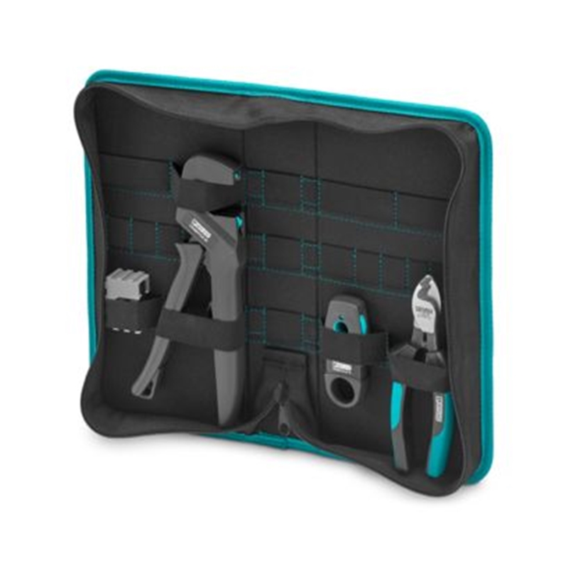 Kit de coupure, de dégainage et de sertissage, conditionné dans un étui à outils, comprennent les produits suivants : CUTFOX 12, WIREFOX-D 11, CRIMPFOX-M, CRIMPFOX-M RJ45/DIE, TOOL-KIT STANDARD EMPTY