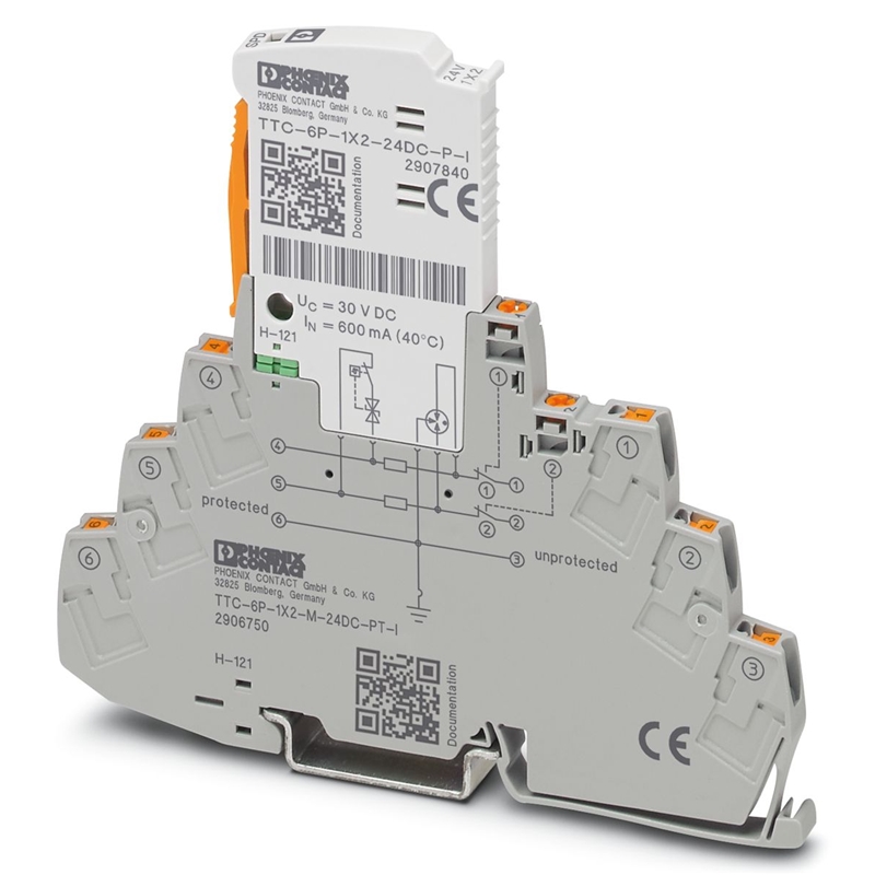 Parafoudre basse tension comprenant une fiche de protection et un élément de base, à indicateur d'état intégré et à couteau de sectionnement, pour un circuit de signalisation bifilaire libre de potentiel de terre, par ex. une boucle de courant 0(4) ... 20 mA, homologation EX e pour zone 2, compatible HART. Utilisable dans des circuits sécurisés jusqu'à SIL 3. TERMITRAB