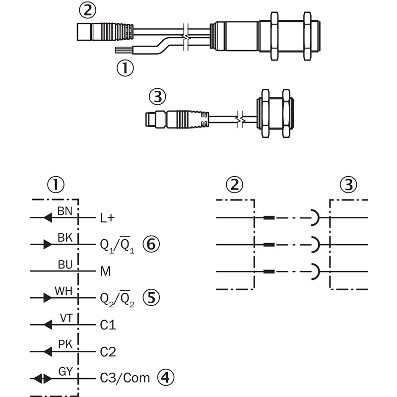 - Récepteur : câble de connexion vers l'émetteur avec connecteur femelle M8, 3 pôles, 1,2 m, PUR