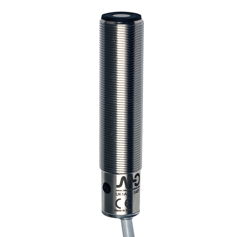 Capteur à ultrasons; Format: Cylindrique fileté, M18 x 1, faisceau axial; Principe de détection: Directe sur l'objet; Plage de détection Sd: 50 ... 400 mm; Portée Sn: 400 mm; Réglage: Teach-in; Précision de répétition: 0,50%; Angle de faisceau: 10° ± 2°; Résolution: max. 3 mm; Sortie analogique: 0-10V; Fonction de sortie: Rampe positive/négative; Sortie de commutation: PNP; Type de commutation: Contact NO/NF; Temps de réponse: 500 ms; Raccordement: Câble 2 m, PVC; Tension d'alimentation: 10-30Vdc; Dimensions: M18 x 1 / L = 83,6mm; Matériau du boîtier: Acier inoxydable AISI316L; Indice de protection: IP67; Température de fonctionnement: –20 °C ... +70 °C; Homologations: CE, cULus; Série: UK1