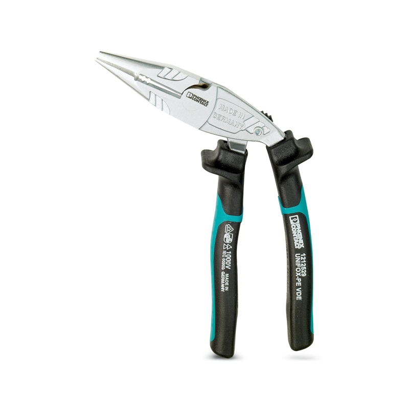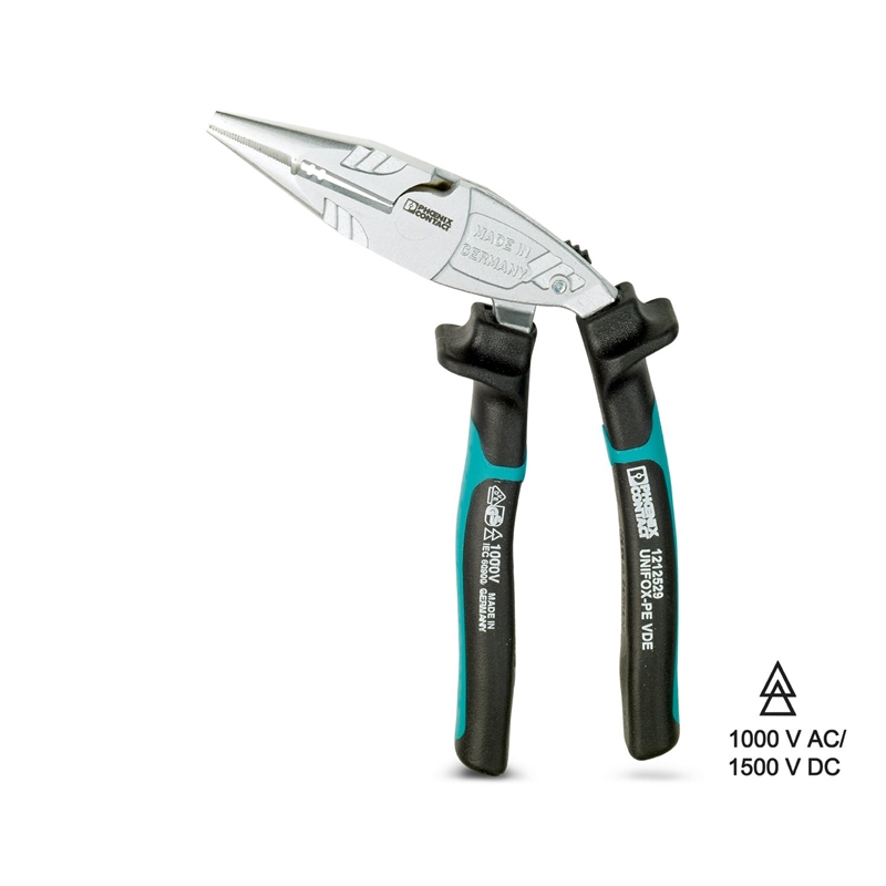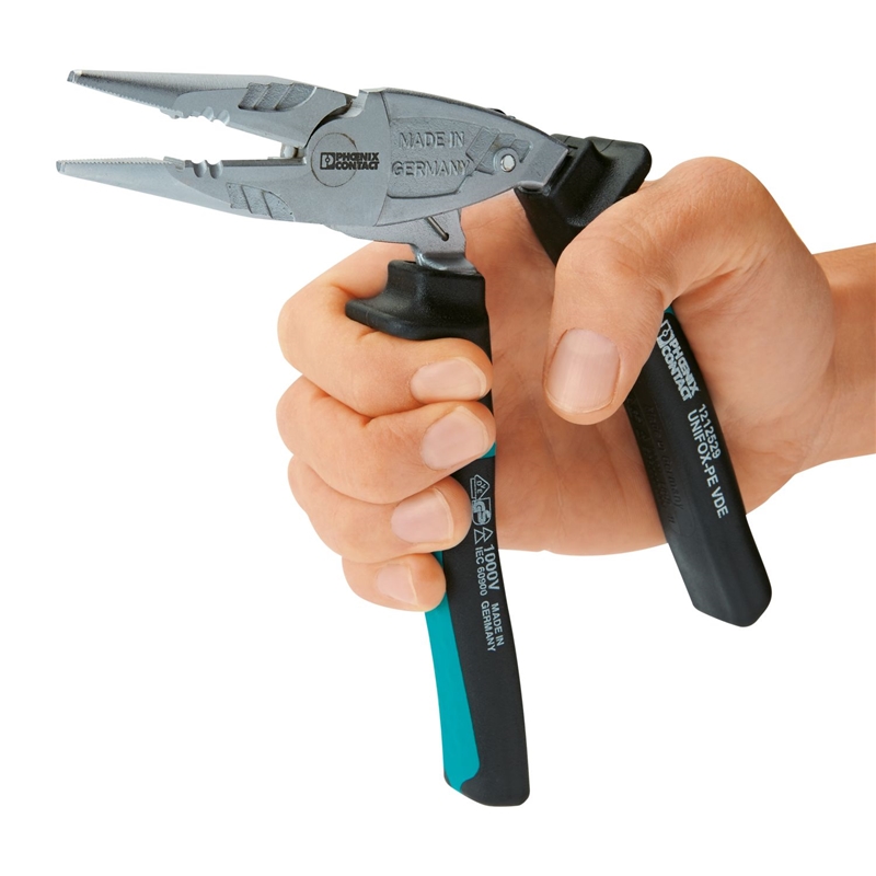 Pince droite, forme coudée, avec ressort d'ouverture et butée, poignée à denture fine, possibilité de dénudage pour 1,5 mm² et 2,5 mm², clé polygonale intégrée M8 - M10, conforme à la norme VDE 1 000 V AC/1 500 V DC