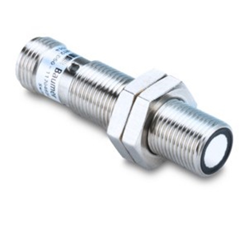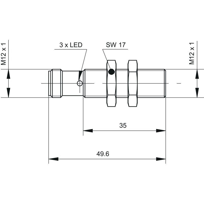 Détecteur de mesure de distance à ultrasons; Format: Cylindrique fileté, M12 x 1; Type de détection: Directe sur l'objet; Version: IO-Link dual channel; Distance de commutation: 15 … 500 mm; Réglage: Line-Teach, IO-Link; Sortie analogique: 4 ... 20 mA / 20 ... 4 mA; Interface: IO-Link V1.1, 38,4 kBaud (COM 2); Raccordement: Connecteur mâle M12, 5 pôles; Tension d'alimentation: 12-30Vdc; Diamètre: 12 mm; Longueur totale du boîtier: 49.6 mm; Longueur de filetage utile: 35 mm; Matériau du boîtier: Laiton nickelé; Indice de protection: IP67; Température de fonctionnement: -25 ... +65 °C; Série: UR12
