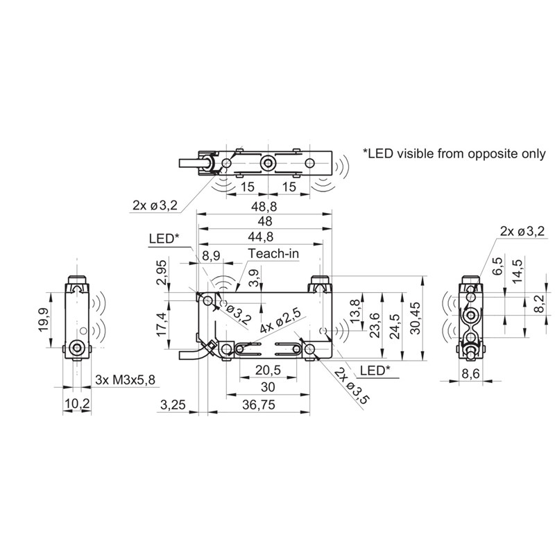Détecteur à ultrasons; Format: Parallélépipédique, faisceau axial; Type de détection: Barrière reflex; Distance de commutation: 0 ... 200 mm; Réglage: Teach-in; Sortie de commutation: Push-Pull; Type de commutation: Contact à fermeture/ouverture (NO/NF); Raccordement: Câble 2 m; Tension d'alimentation: 12-30Vdc; Dimensions (L x H x P): 8,6 x 46 x 30,5 mm; Indice de protection: IP67; Température de fonctionnement: 0 ... +60 °C; Série: 09