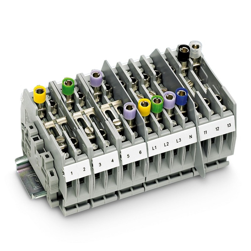 Bloc de jonction de sectionnement pour essais, avec deux alvéoles pour fiche test, pour point test de 4 mm ou bien pour ponts de commutation ou à visser, tension nominale: 400 V, intensité nominale: 41 A, type de raccordement: Raccordement vissé, Section de référence: 6 mm², section : 0,5 mm² - 10 mm² , type de montage: NS 35/7,5, NS 35/15, NS 32, coloris: gris