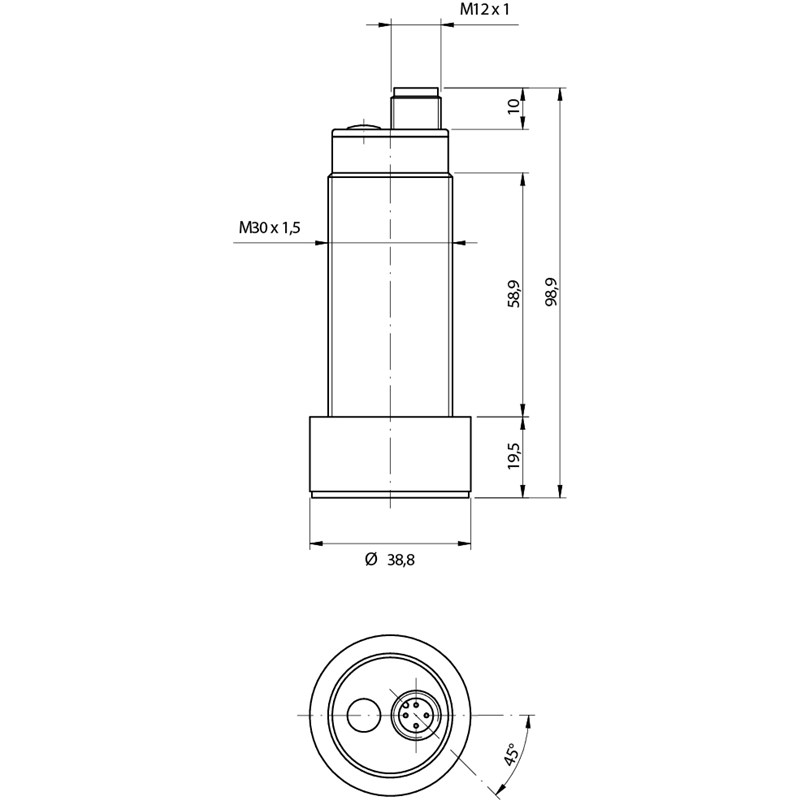 Ultrasonic sensor M30 housing with large shape transducer ø 38,8 mm, NPN adjustable hysteresis + standard window, 350-6000 mm, plug M12 with teach-in button, cULus