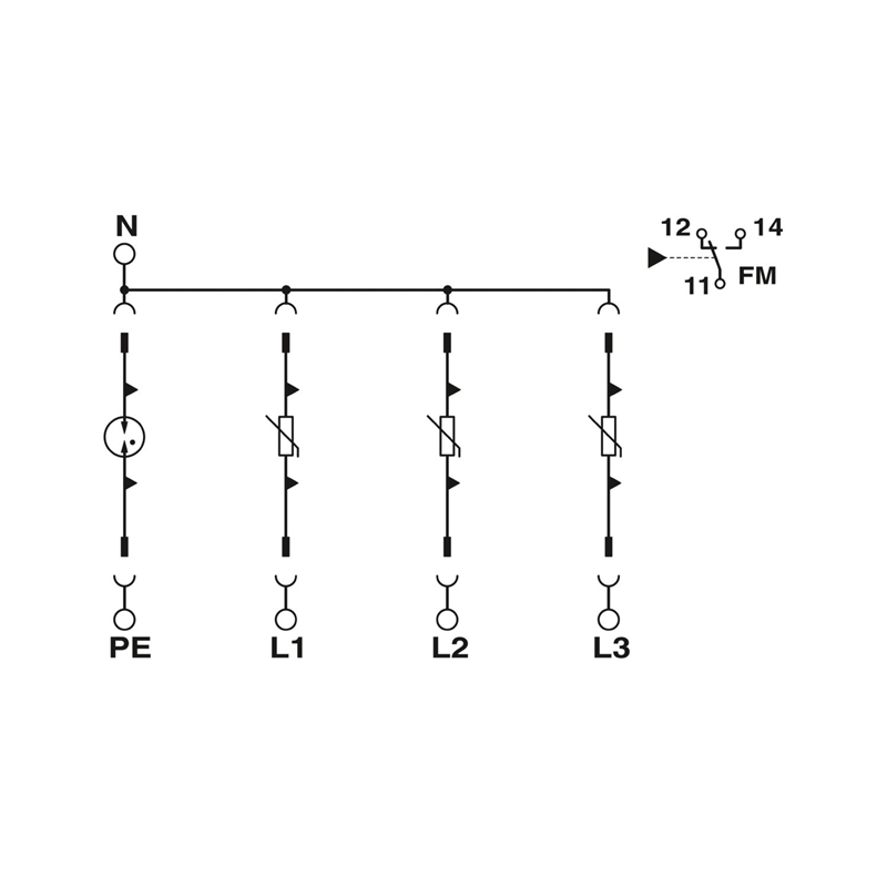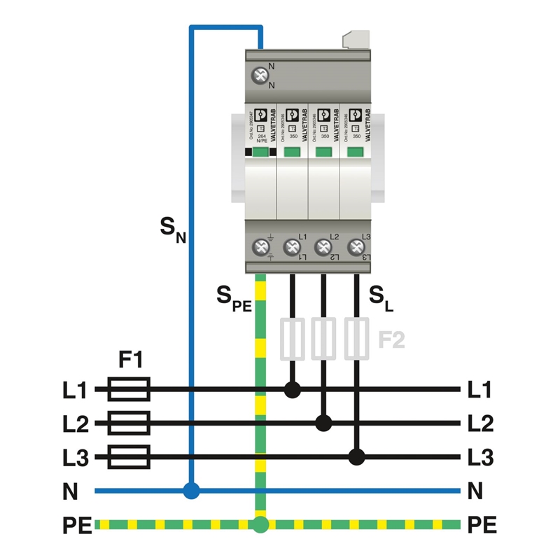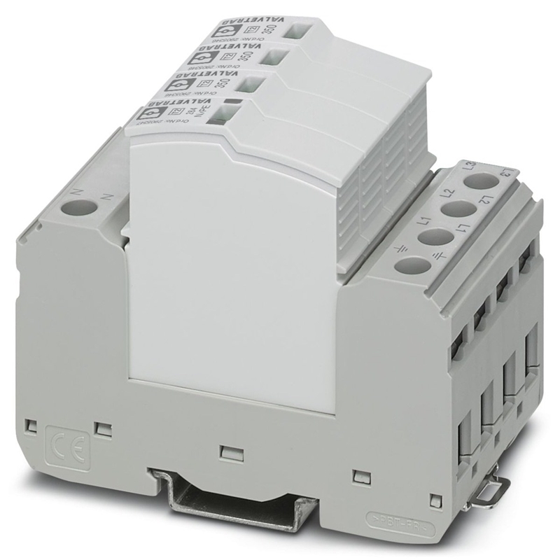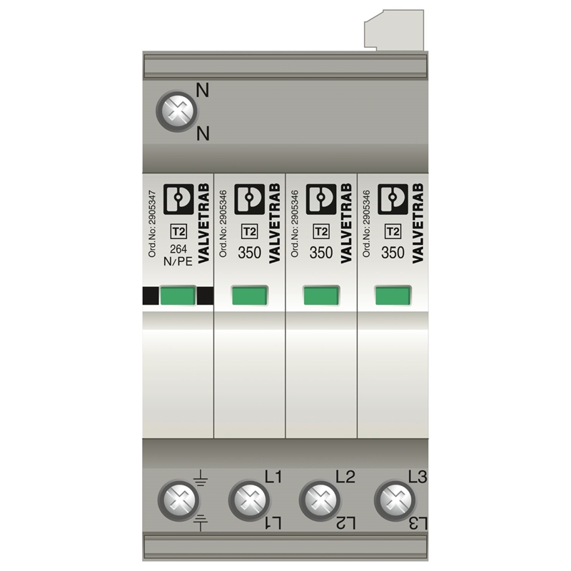 Parafoudre enfichable, Triphasé+N - Type 2 - Uc : 350 VAC - In : 20 kA - Up : 1,9kV - avec contact de défaut - Schéma TT et TN (système à 5 fils : L1, L2, L3, N, PE) (Fiches garanties 5 ans), VALVETRAB SEC