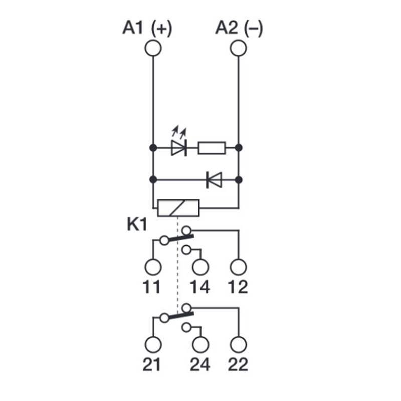 Module à relais électromécaniques; Tension d'alimentation nominale: 24 Vdc; Courant de contact: 8 A; Nombre de canaux: 1; Type des contacts: 2PDT (2 échange); Montage: Sur rail, placés côté à côté ou sur panneau au moyen d’une vis centrale; Raccordement: Borniers à vis 2.5 mm² fixes; Dimensions (l x h x p): 16 mm x 75 mm x 75 mm; Indice de protection: IP00 (IEC529, EN60529); Température ambiante (service): -20...+80°C; Série: CM