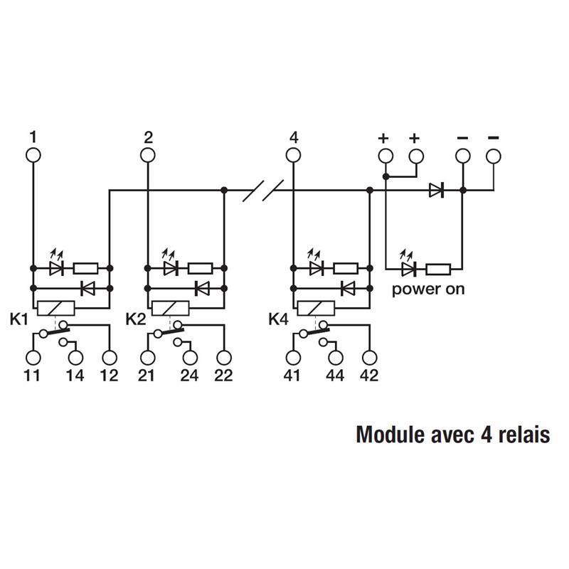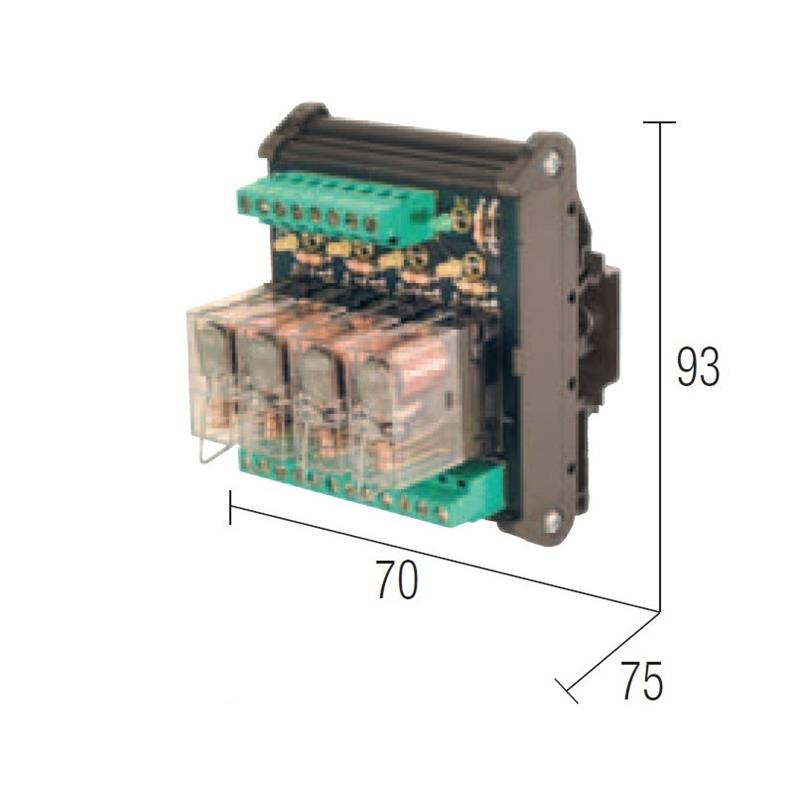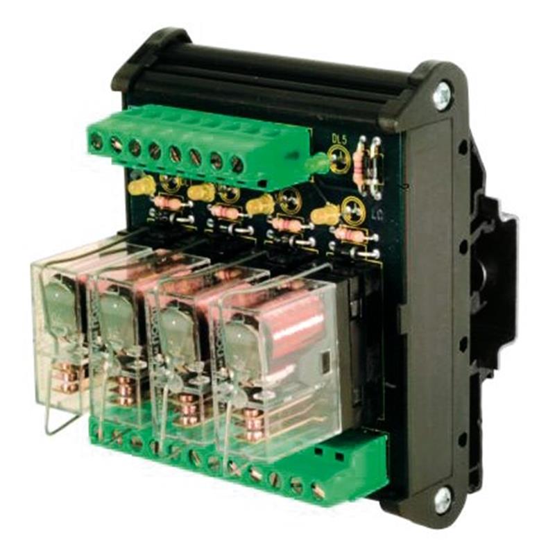 Module à relais électromécaniques; Tension d'alimentation nominale: 24 Vdc; Courant de contact: 12 A; Nombre de canaux: 4; Type des contacts: SPDT (1 échange); Montage: Sur rail, placés côté à côté; Dimensions (L x H x P): 70 mm x 93 mm x 75 mm; Nombre de pièces par boîte: 1; Série: R